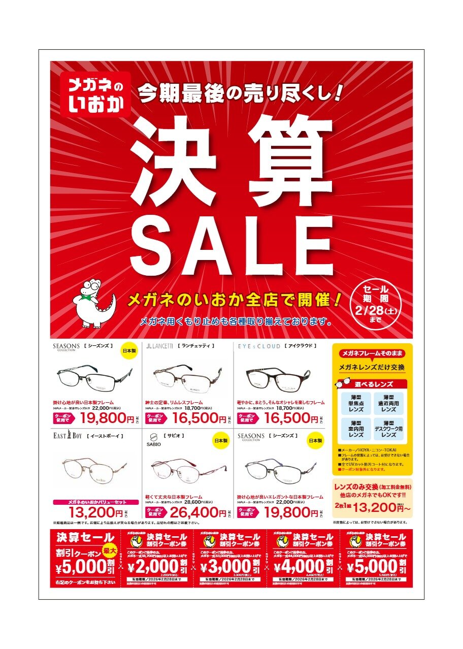 今期最後の売り尽くし!決算SALE 開催中です。 2026年01月27日(火) メガネのいおかでは、今期最後の決算セールを実施しています。 クーポン券使用で更にお買い得!!くもり止めも各種取り揃えております。 補聴器の無料貸し出しも実施中!ぜひこの機会にお近くのメガネのいおかにご来店下さい。 キャンペーン期間 2026年1月24日(土)から 2026年2月28日 (土) まで