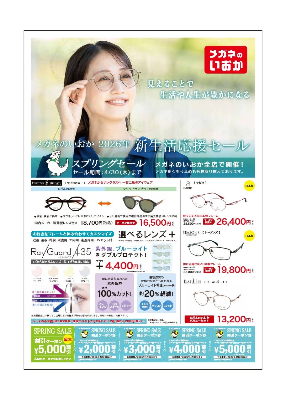新生活応援セール 2026年03月05日(木) メガネのいおかでは、新生活応援セールを実施しています。 新作メガネも続々入荷中!お買い得商品満載です!! 補聴器の無料貸し出しも実施しております。ぜひこの機会にお近くのメガネのいおかにご来店下さい。 キャンペーン期間 2026年3月7日(土)から 2026年4月30日 (木) までです。