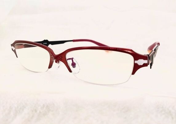エヴァンゲリオンの非日常を表現するためにあえて眼鏡の構造としては珍しい左右非対称で設計しました。素材はチタンを使用しているので凝った作りの割には軽く感じられると思います。また、フロントとテンプルを繋ぐ部品にはβチタンを使用することでフィット感が格段に増し、掛け心地の良い眼鏡となっております。